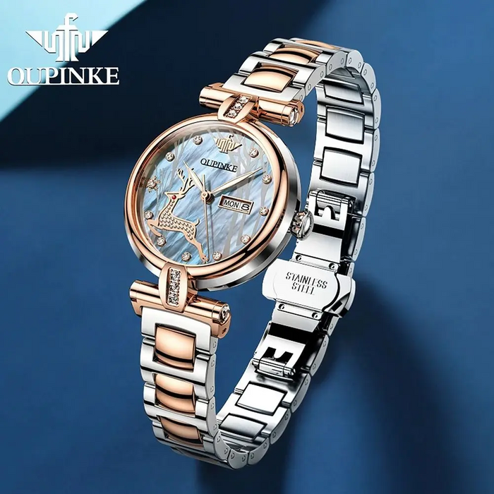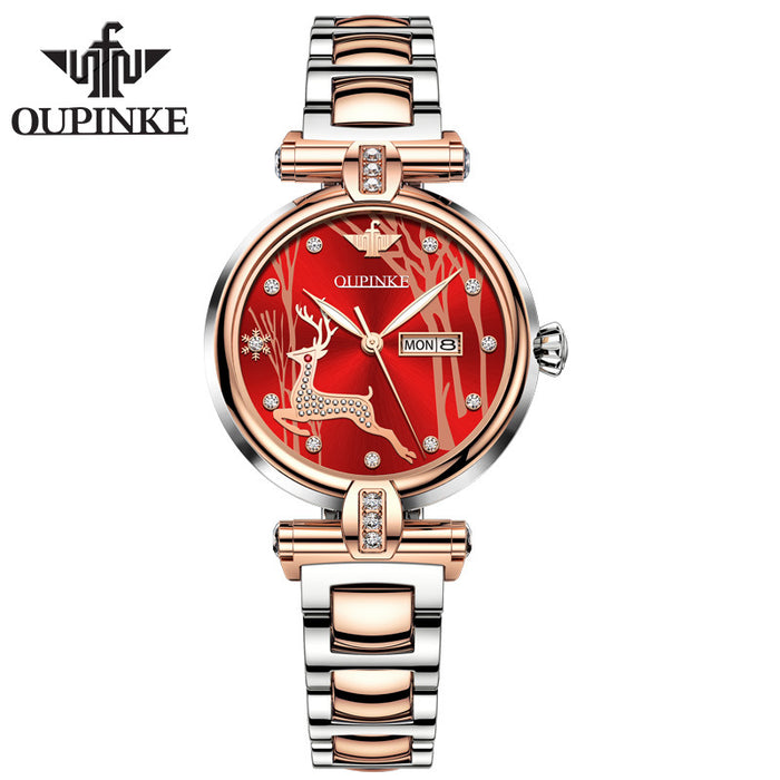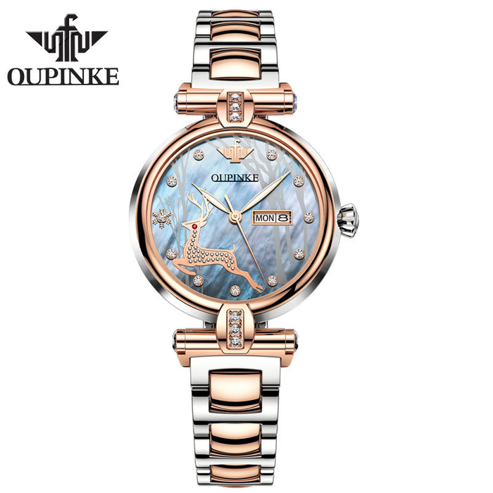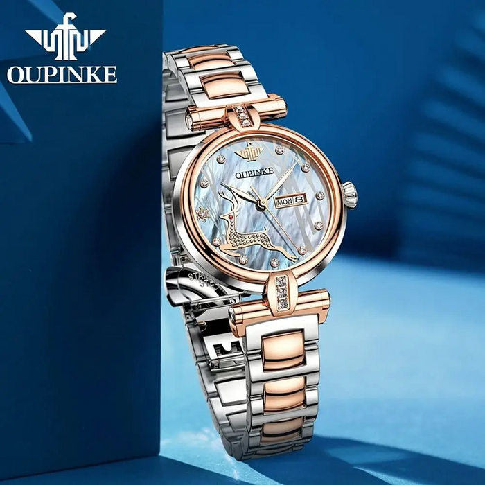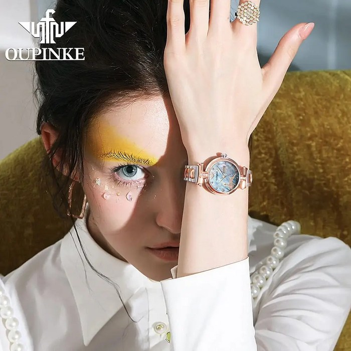 La OUPINKE 3180 est une montre féminine haut de gamme alliant élégance, précision et matériaux nobles. Conçue avec un mouvement automatique importé, elle fonctionne sans pile et incarne l’art horloger moderne.