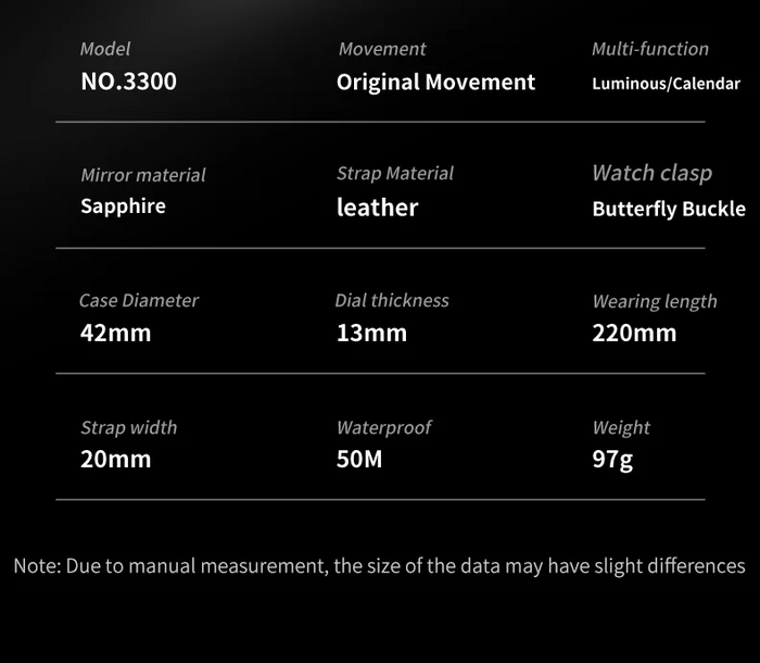 La OUPINKE 3300 offre une multitude de fonctions : phase de lune, chronographe, calendrier complet, affichage des jours, fuseaux horaires multiples et luminosité nocturne. Avec une étanchéité jusqu’à 5 BAR (50 mètres), elle résiste parfaitement à l’eau et aux chocs.