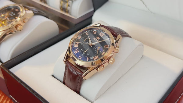 La montre OLEVS 2871 associe un style raffiné à une touche sportive. Son cadran rond avec chiffres romains et son bracelet en cuir véritable offrent un confort et une allure sophistiquée.