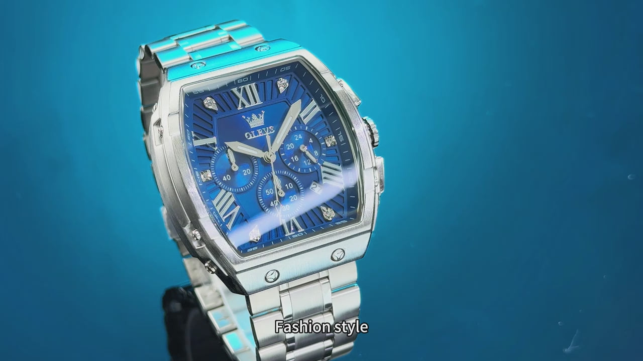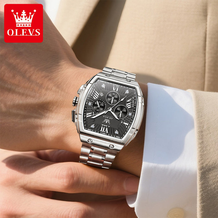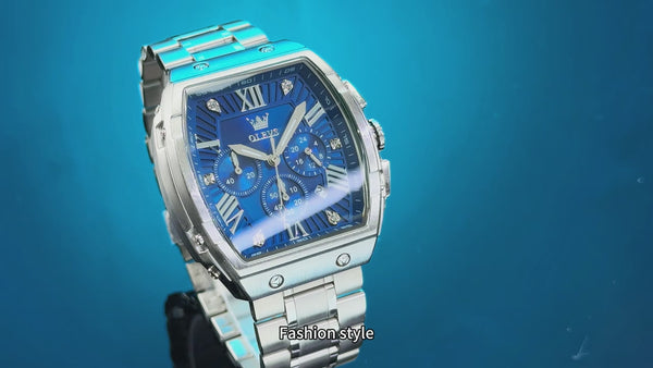 La OLEVS 5639 se distingue par son boîtier tonneau (rectangulaire arrondi), alliant allure moderne et élégance sportive. Son cadran à chiffres romains et sa finition métallique en font un accessoire raffiné et puissant.